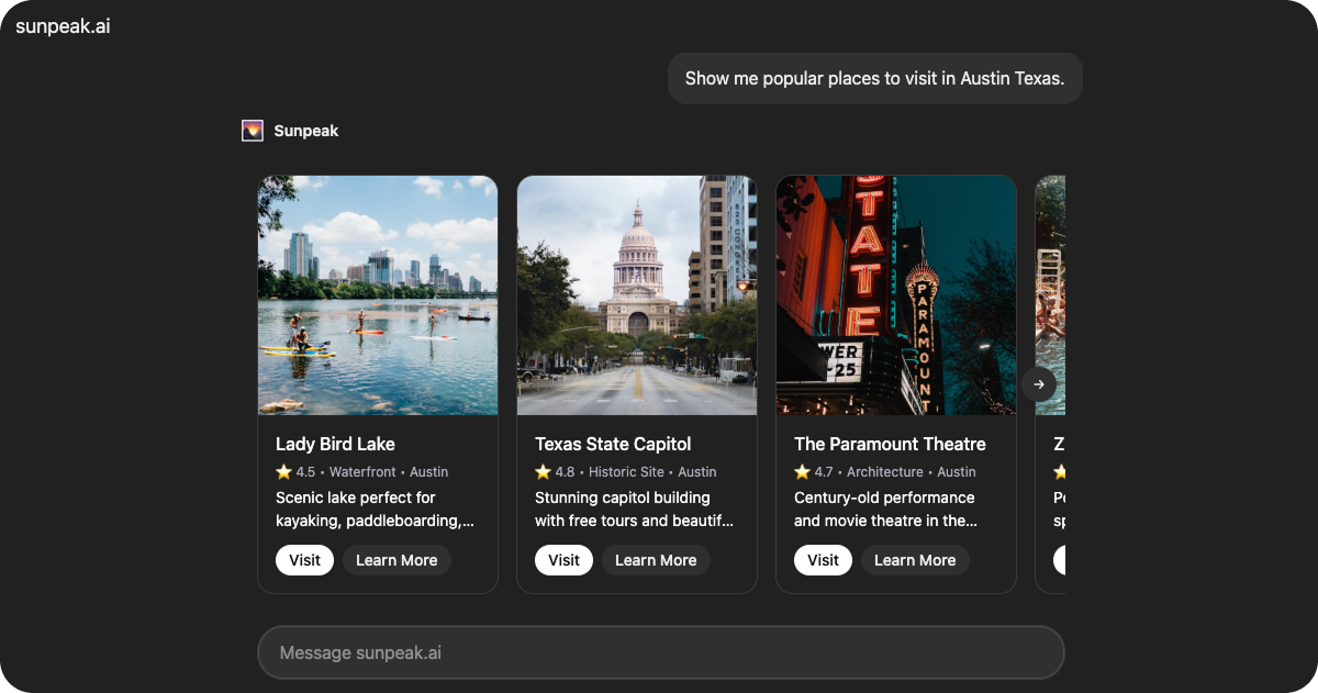 Carousel is a production-ready carousel resource included in the sunpeak framework. It displays places or items in a horizontal scrolling carousel with card components, featuring navigation arrows, edge gradients, and interactive buttons.