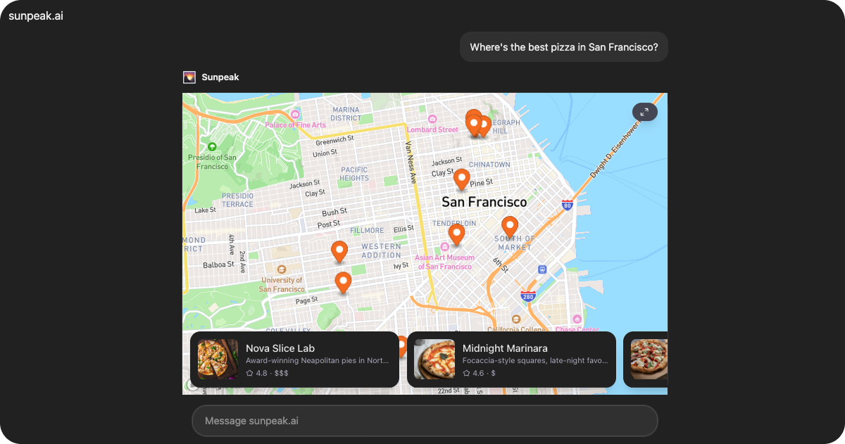 Map is a production-ready map resource included in the sunpeak framework. It displays pizza restaurants on an interactive map with list and carousel views, switching between inline and fullscreen display modes for different browsing experiences.